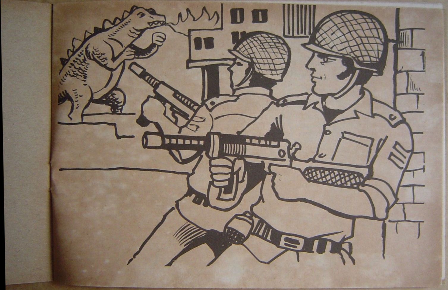 Don't worry, because Secret Agent Captain Anglo and Kenny are on the scene. And don't look now, but Godzilla is right behind you!!! Nope, I think it's--again--supposed to be that lovable goofy miscreant, Godzooky. If you ask me, it looks like Godzooky is shouting "GODZILLA"...